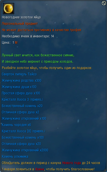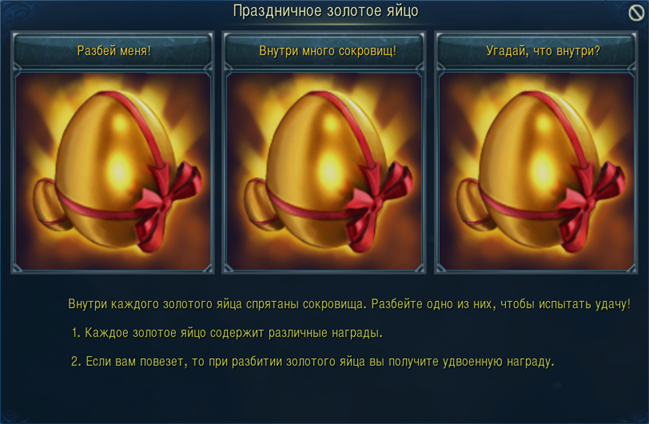 Примечание: если оставить новогодние золотые яйца до 1 января и затем открыть их, то находясь в городе Хэяне, шанс на получение редких призов многократно возрастет. Благословение удачи будет действовать только один день!