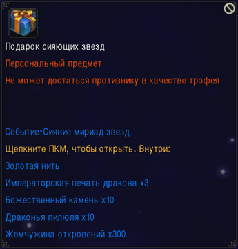 Примечание: если вечерний фестиваль состоится, все игроки смогут получить «Подарок сияющих звезд». Откройте его не менее 28 раз на протяжении всего события, чтобы выполнить новое достижение на сайте игры.