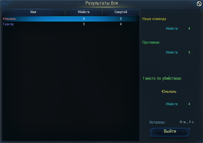 3. Если все игроки одной стороны покинули поле боя (добровольный выход или потеря соединения), и в течение 60 секунд игроки этой стороны не подключились обратно, побеждает противоположная сторона;